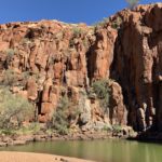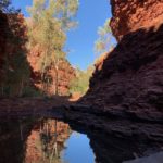Diese Gegend wird durch ein gewaltiges Schluchtensystem durchzogen mit bis zu 150 m tiefen, senkrechten Spalten. Kurz nach dem Mittag erreichten wir den Campsite Eco Retreat, buchten unseren Stellplatz und fuhren gleich zur ersten Wanderung den Weano Gorge und den Hancock Gorge sowie den Knox Gorge. Ein Idyll mit Sonnenduchfluteten Schluchten und roten Wände. Gut sichtbar waren die waagrechten Schichtstrukturen und die intensiven rostroten Farben und die vielen Schattenspiele der bizarren Felsen. Unten in der Schlucht fand man auch tolle Pools, welche zum Baden einluden. Das Abendessen nahmen wir im Campingrestaurant auf der romantischen aber natürlich kühlen Terrasse ein. Eine Live Musik rundete die Stimmung ab. Am anderen Tag fuhren wir zum Informations Centrum wo wir eine Nacht auf dem Dales Campground buchten. Der Dales Gorge sowie die Fortescure Falls und den Fern Pool waren angesagt. Wir stiegen auf einer Metalltreppe hinunter zu den Fortescure Falls wo sich einige junge Leute auf den Treppenformigen Felsen sonnten und den Sprung ins kühle Nass wagten. Alle schienen sich herrlich zu amüsieren. Ein kleiner Stich zum Fern Pool und zurück und weiter auf dem Fortescure Falls Treck. Es war so wunder schön, die vielen verschiedenen Wasserläufe, Bäume und Gräser und alles in eindrücklichen Felsen gepackt. Am Ende des Trecks meldete sich ein dringendes Bedürfnis an und somit stiegen wir hoch aufs Plateau wo es ein WC hatte. Von oben schauten wir in die Tiefe das Dales Gorge und wanderten auf diesem Weg wieder zurück zum Parkplatz wo Hiru schon wartete. Als wir den Camping erreichten sahen wir, dass unsere Freunde Susanne und Yves auch da waren aber leider war niemand zuhause. Für den Abend meldeten wir uns bei einem «Planetarium» an, welches von einem Mann (ebenfalls im Campingbus) durchgeführt wurde. Um 18:30 Uhr trafen wir eine Gruppe von ca. 25 Personen und schauten zwei Stunden in den Sternenhimmel. Dieser wurde mit vielen Informationen durch den Mann und drei verschiedenen Teleskope erweitert und verdeutlicht. Um 21:00 liefen wir halb verfroren zum Auto und schlüpften so schnell wie möglich in unsere warmen (ich mit doppeltem) Schlafsäcke. All diese wirklich wunder schönen Eindrücke mussten wir zuerst verdauen.