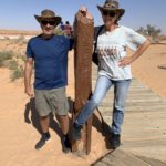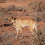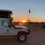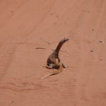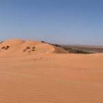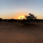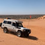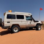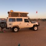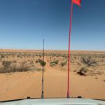 Tag 3. Gleich nach dem Sonnenaufgang frühstücken wir bevor es heiss wird. Plötzlich sahen wir wie sich uns ein Dingo näherte. Er war für mein Gefühl etwas frech und so entschieden wir im Auto weiter zu essen. Er entfernte sich dann so gleichgültig, aber wir wussten er war da und beobachtete uns. Als wir um 09:45 wegfuhren war er tatsächlich hinter einem Gebüsch und schaut uns nach. Schon bald kamen wir an eine sehr anspruchsvolle Düne mit vielen Pumps in der Auffahrt und blieben zum ersten mal stecken. Wir liessen noch mehr Luft aus unseren Reifen und fuhren im Low Ger im 2. Gang hoch. Beim 3. Anlauf klappte es mit fast 4’000 Touren. Der Motor heulte auf und wir schafften es hinauf. Solche Dünen hatten wir von nun an viele und der Trak war voller tiefen Pumps. Wir konnten nur zwischen 5 bis max 15 Kmh fahren. Auch heute hatten wir auf den 117 km während 8 Std. nur eine Begegnung mit anderen Fahrzeugen, wobei auch hier bei einem zwei Kinder mit dabei waren. Ziemlich müde übernachteten wir wieder irgendwo im Nirgendwo.
